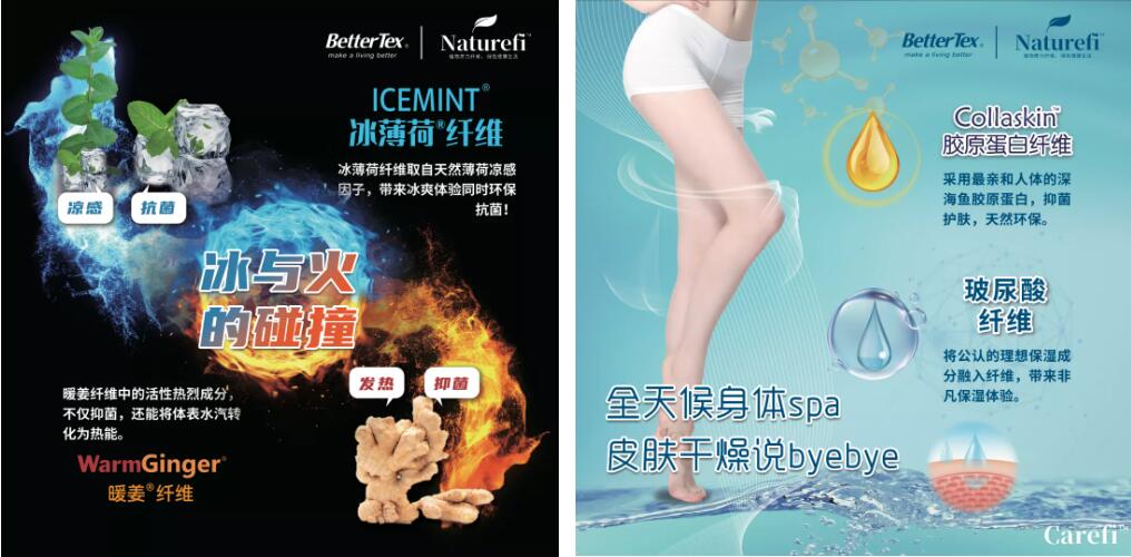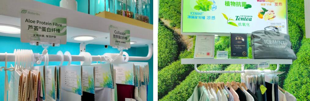 據(jù)介紹,ICEMINT®冰薄荷®纖維采用超臨界植物萃取技術(shù)萃取薄荷中的有效成分,與天然木漿混合加工而成,具有抗菌消臭、天然涼感、植物防螨等特性;Warmginger®暖姜®纖維取自天然植物姜,具有天然草本抗菌及吸濕發(fā)熱功能;Tentea®天茶®茶多酚纖維,將茶葉中的有效物質(zhì)天然萃取,利用獨(dú)特工藝將茶葉中的天然提取物均勻分布于天茶纖維內(nèi)部,具有植物抑菌除臭、抗病毒、茶多酚抗氧化、易去污等特性。
