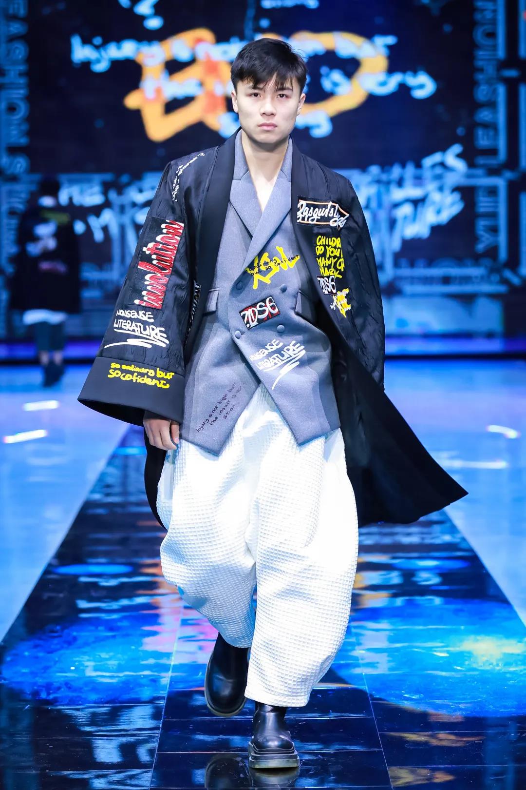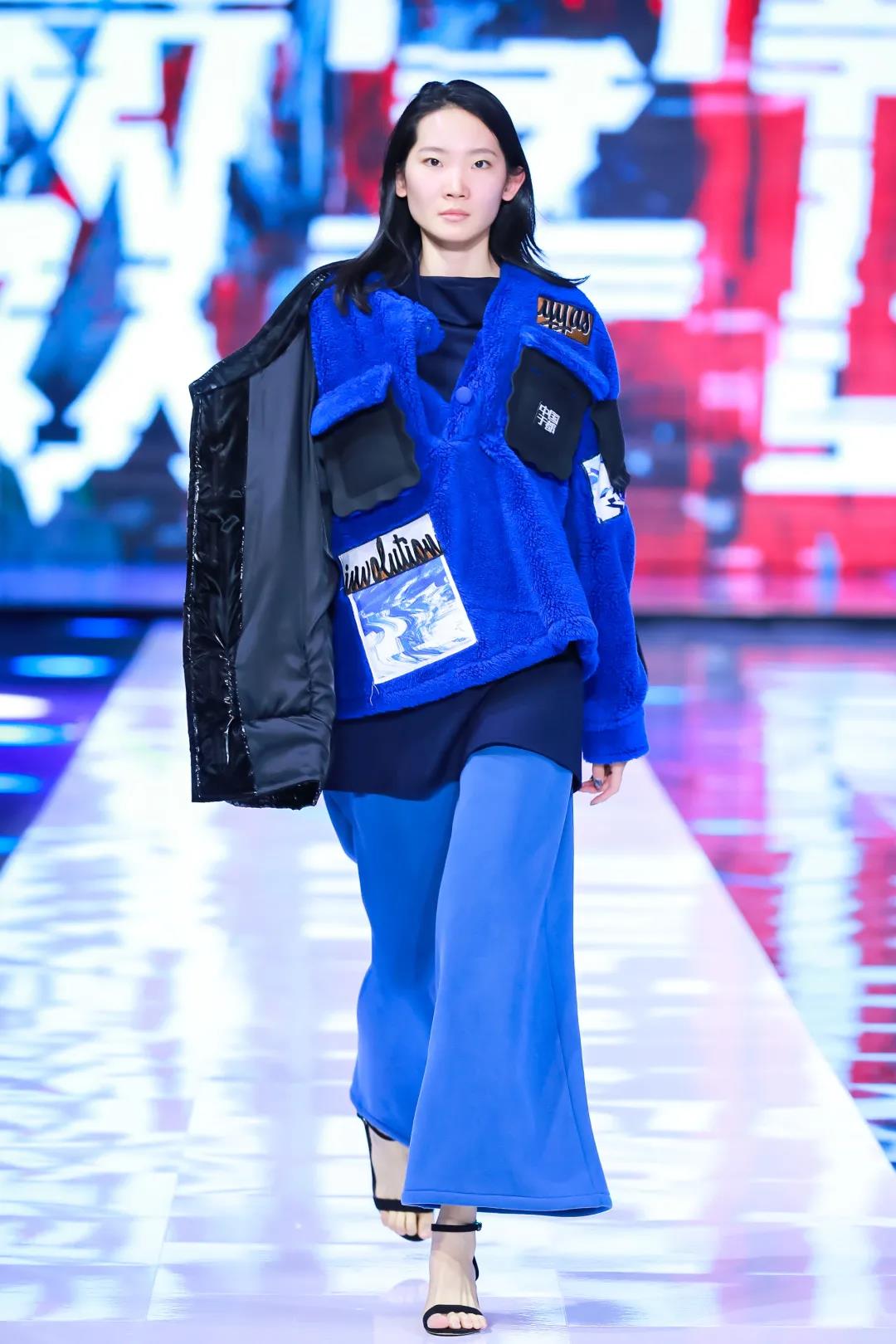 第一系列以RGB光模式里藍色調(diào)為主,以具有未來感空氣層面料與藝術牛仔面料進行碰撞,以挺括寬松的版型表達新世代輕松灑脫、不拘一格的氣質(zhì)。在圖案上,將設計師的創(chuàng)作的具有中式風格的書法與抽象水墨作品進行藍色漸變映射,再將圖形線條進行錯位化處理,在中式風格的基礎中呈現(xiàn)與數(shù)字化融合中偶然產(chǎn)生的出人意料的美。