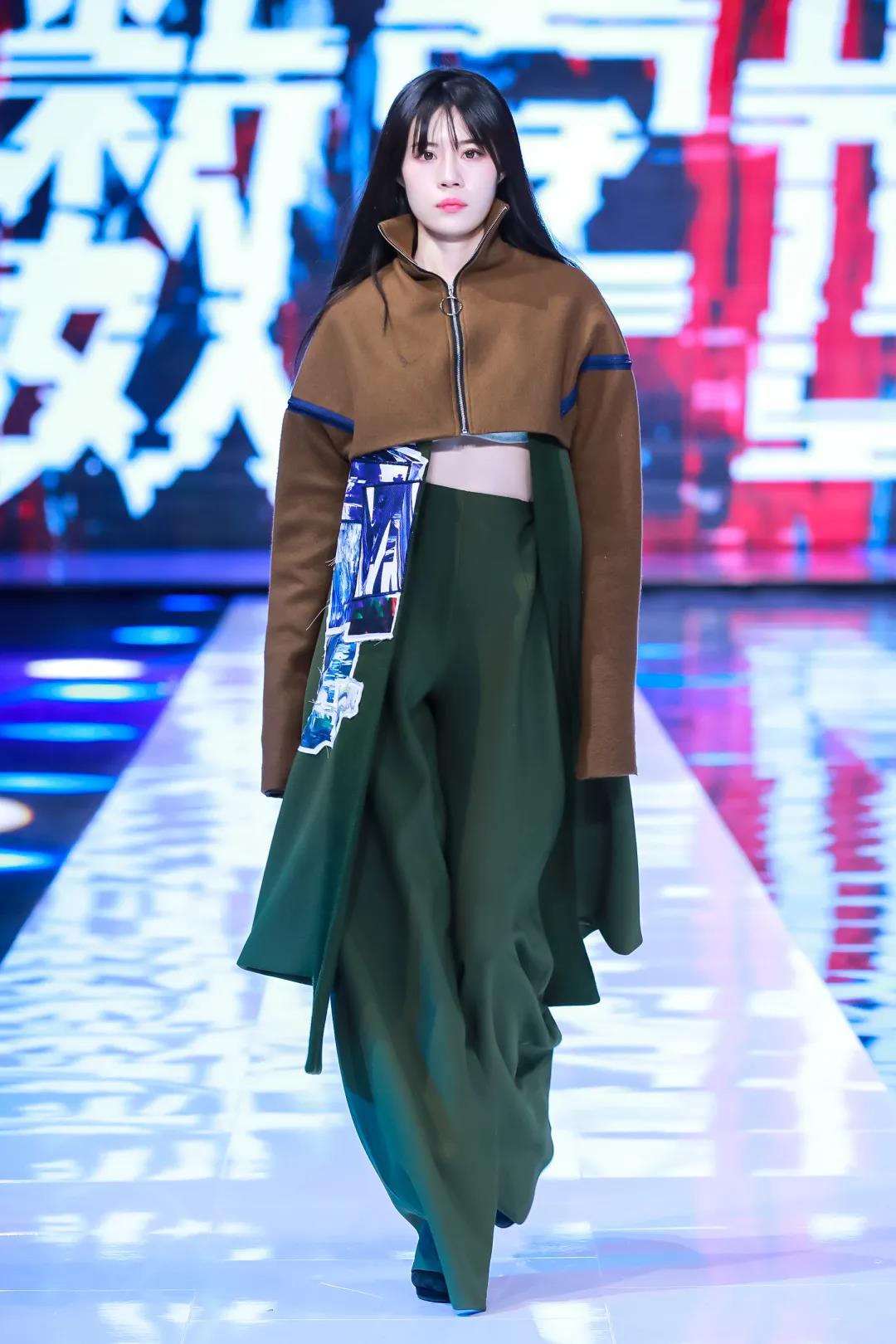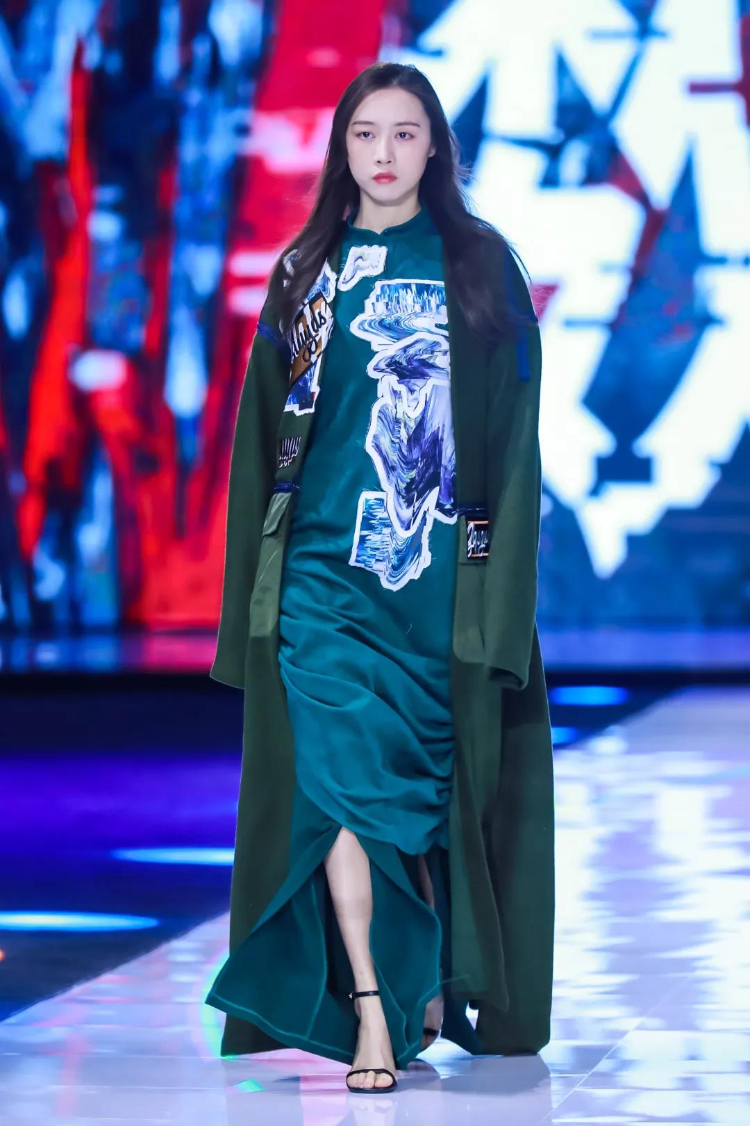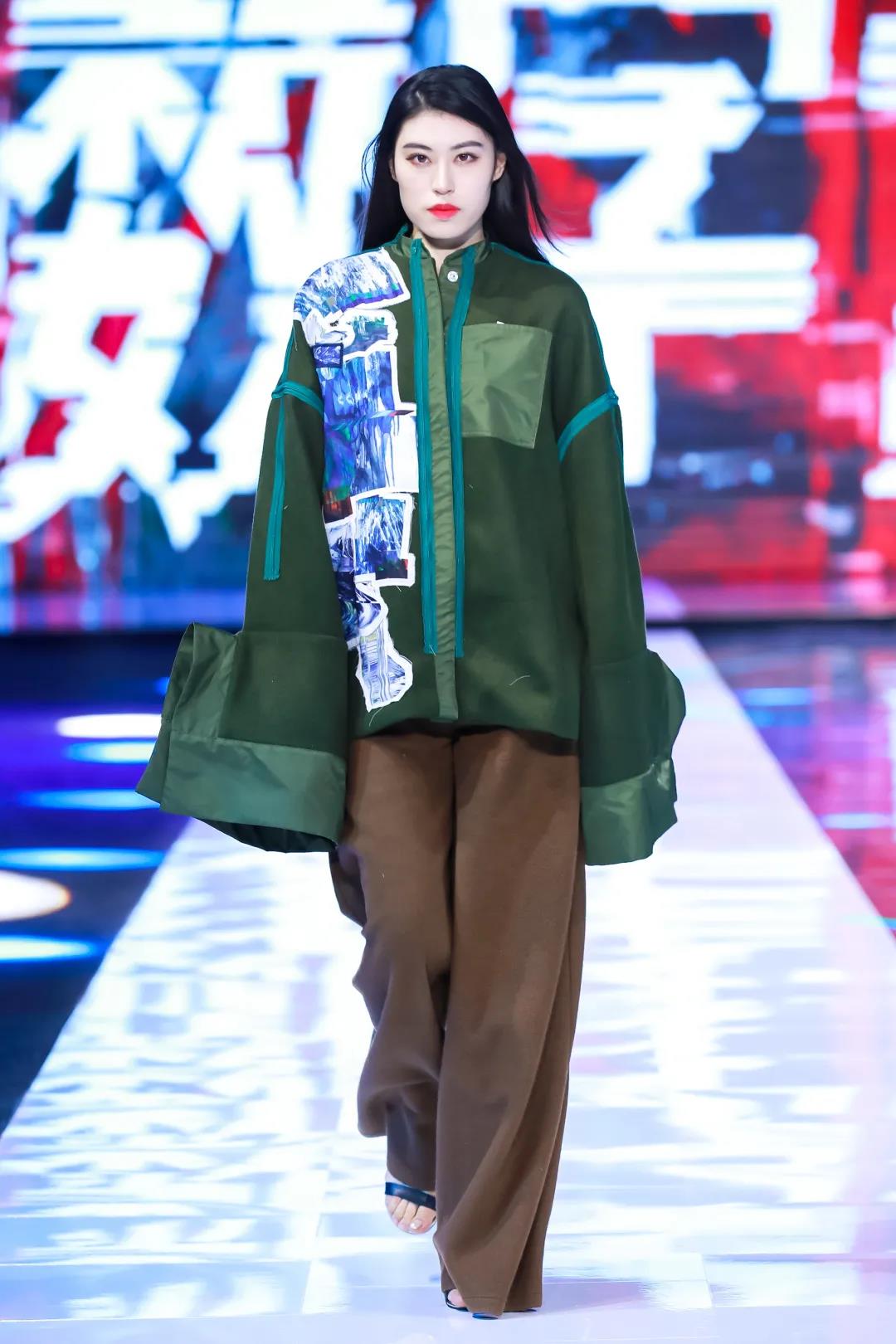 第二系列以綠色調(diào)為主,保留中式服裝寬衣博袖的特點,選用寬松平板的服裝版型,搭配多種質(zhì)感的面料營造出層次感,再加入電子切割的異形布貼,將設計師的抽象繪畫與數(shù)字化融合,使用色彩分離與位移的處理,呈現(xiàn)出數(shù)字化世界特殊的電波與色彩的動感。