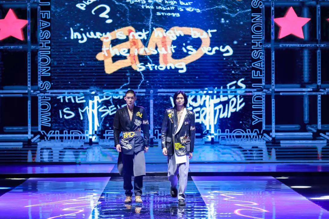 本次發(fā)布秀主題以數(shù)字化世界為創(chuàng)作靈感,將藝術與數(shù)字世界的關系作為中心,以數(shù)字世界里RGB光模式里的三原色,藍、綠、紅為主色調(diào),再以設計師的抽象繪畫作品作為基礎,加入RGB顏色分離、圖像位移等視覺處理,將抽象繪畫作品的結構與色彩進行數(shù)碼化的二次抽象,再將圖案以不同大小的形狀用以藝術拼貼的方式融入到服裝上,表達數(shù)字化世界里被屏幕充斥視覺的感受。