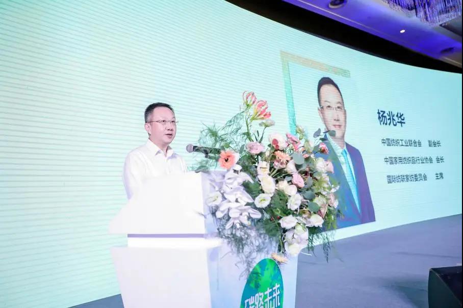 中國(guó)紡織工業(yè)聯(lián)合會(huì)副會(huì)長(zhǎng)、家用紡織品行業(yè)協(xié)會(huì)會(huì)長(zhǎng)楊兆華作了《碳路未來(lái),強(qiáng)品牌》主旨演講。