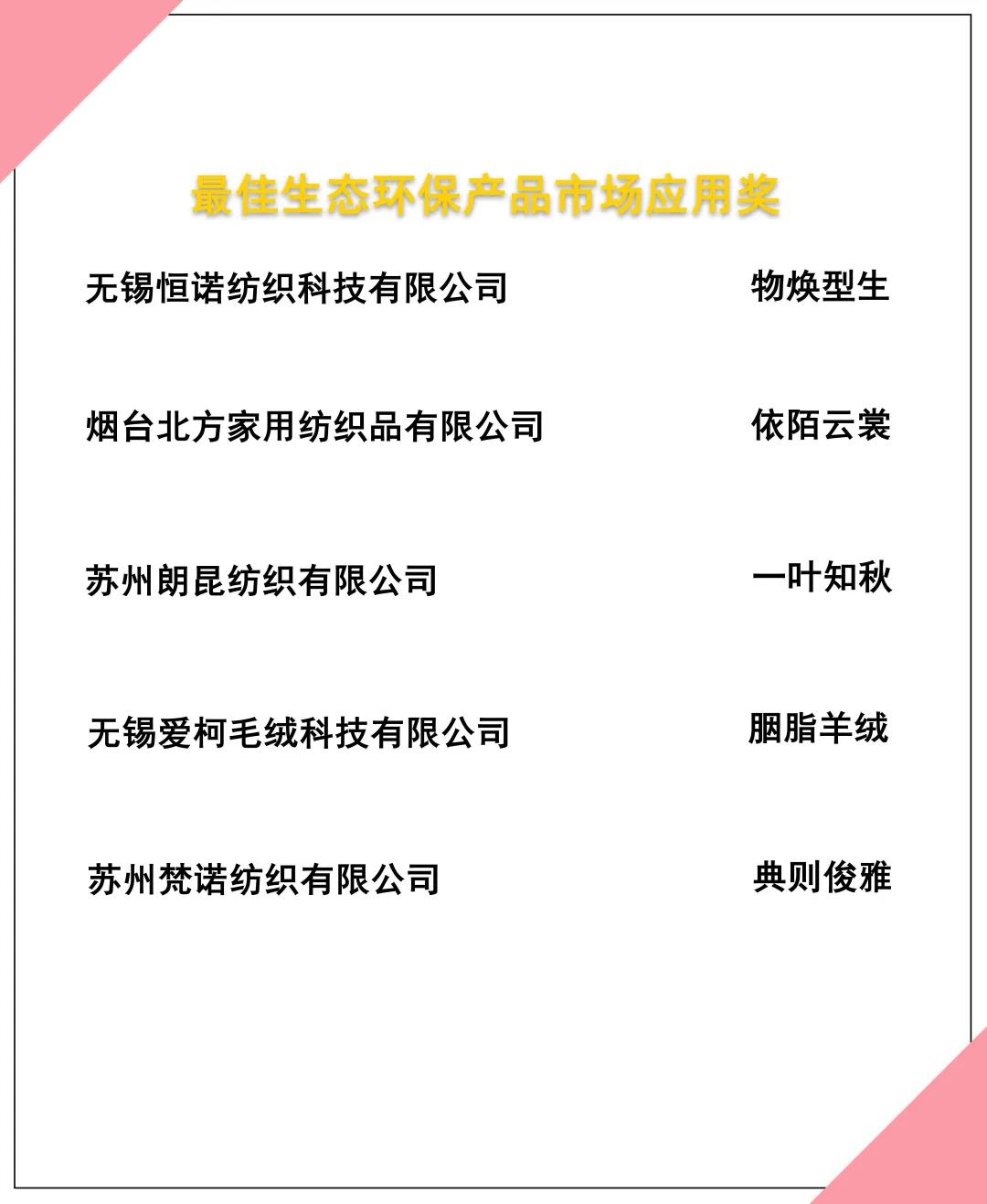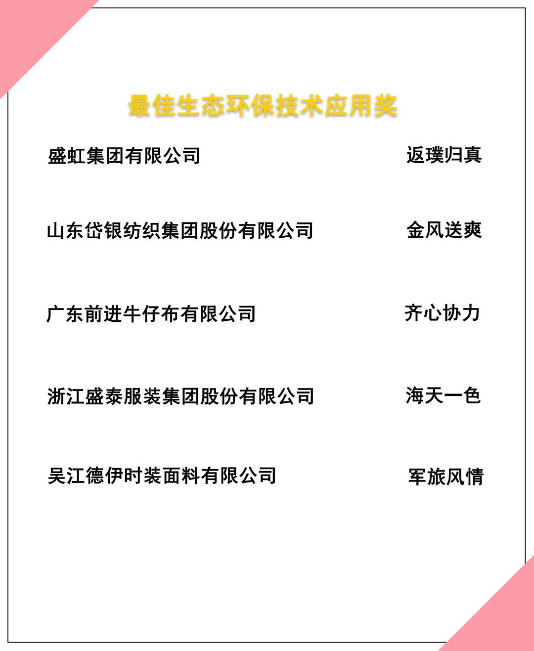 在綜合評(píng)審專家的評(píng)審意見(jiàn)及驗(yàn)證小組的線上驗(yàn)證評(píng)價(jià)基礎(chǔ)上,大賽最終評(píng)選出來(lái)自115家企業(yè)的187款優(yōu)秀面料,決出“最佳生態(tài)環(huán)保材料應(yīng)用獎(jiǎng)”、“最佳生態(tài)環(huán)保技術(shù)應(yīng)用獎(jiǎng)”及“最佳生態(tài)環(huán)保產(chǎn)品市場(chǎng)應(yīng)用獎(jiǎng)”三個(gè)單項(xiàng)大獎(jiǎng)。