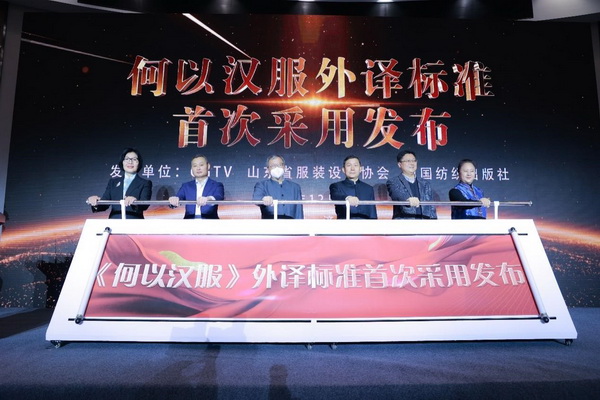 會(huì)上,山東省服裝設(shè)計(jì)協(xié)會(huì)會(huì)長周錦、北京服裝學(xué)院科技處處長王永進(jìn)、泰和新材間位芳綸營銷總監(jiān)畢景中、煙臺(tái)明遠(yuǎn)創(chuàng)意生活科技股份有限公司董事長陳義忠、山東服裝職業(yè)學(xué)院副院長殷廣勝、中國藝術(shù)研究院教授李宏復(fù)共同揭曉《何以漢服》外譯標(biāo)準(zhǔn)的首次發(fā)布。