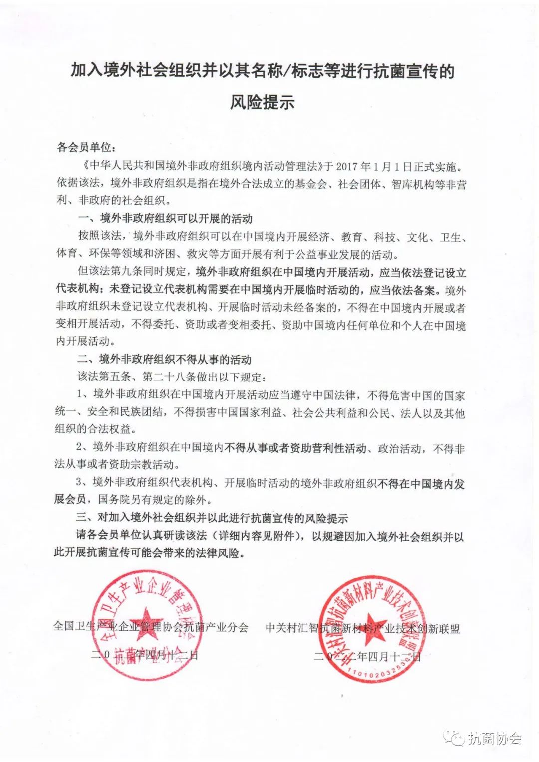 請各會員單位認(rèn)真研讀該法(詳細(xì)內(nèi)容見附件),以規(guī)避因加入境外社會組織并以此開展抗菌宣傳可能會帶來的法律風(fēng)險(xiǎn)。
