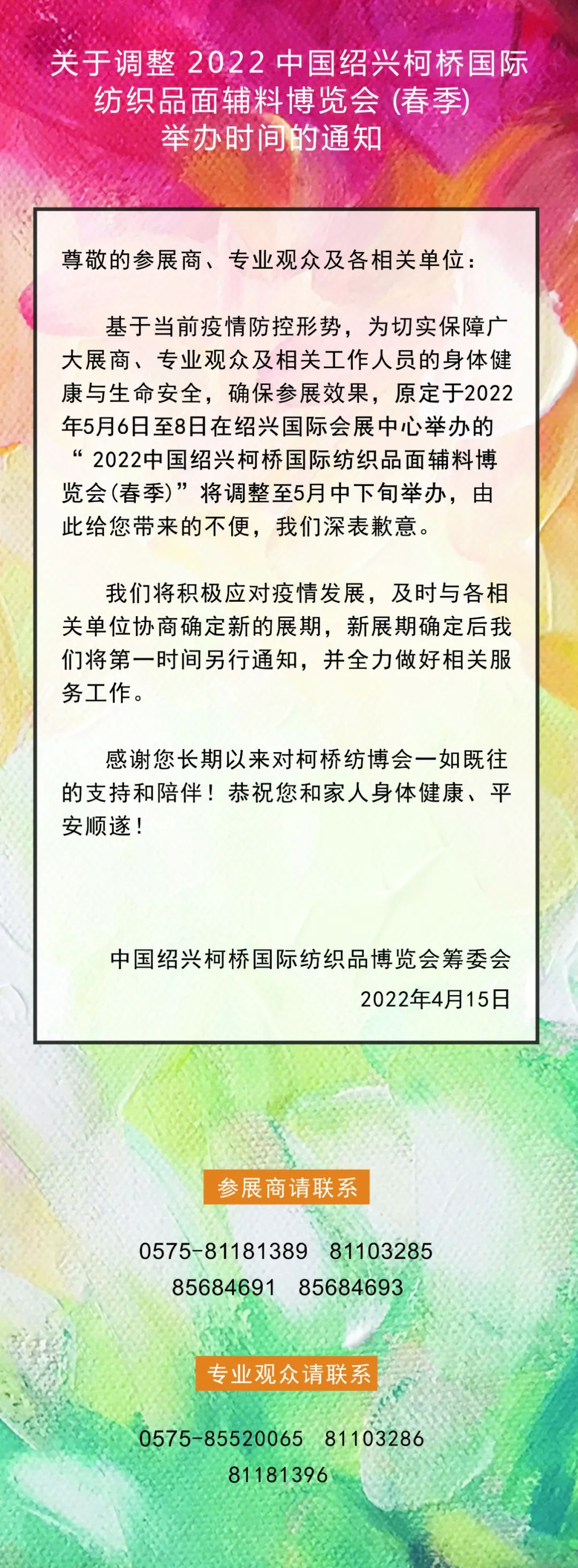關(guān)于調(diào)整2022中國(guó)紹興柯橋國(guó)際紡織品面輔料博覽會(huì)(春季)舉辦時(shí)間的通知