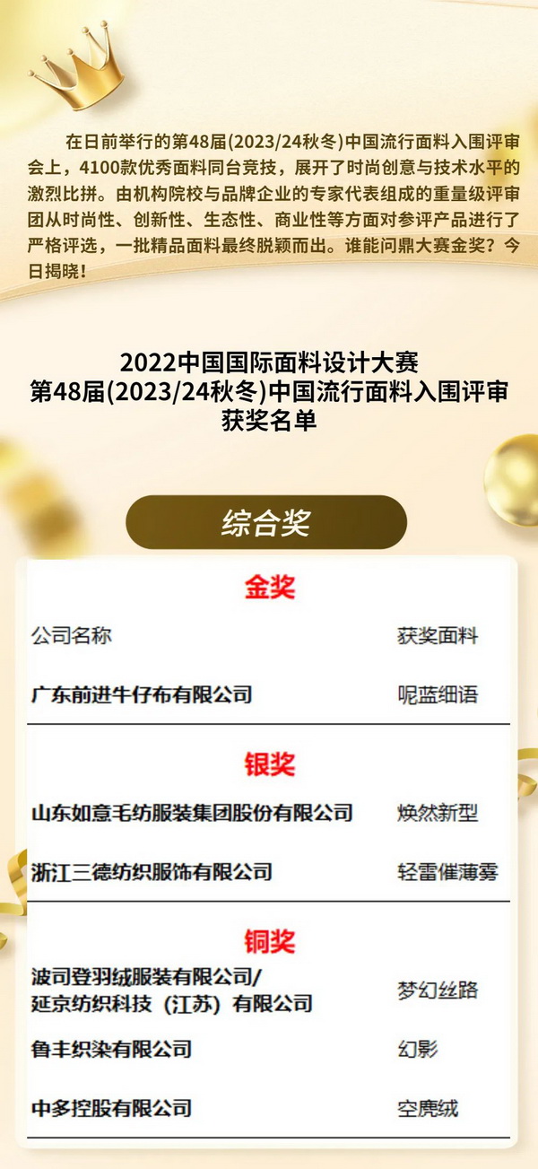 【賽事揭榜】第48屆(2023/24秋冬)中國流行面料入圍評審獲獎名單出爐!