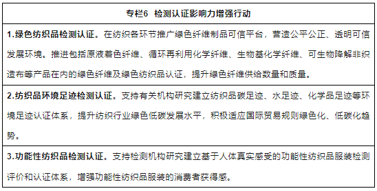 20.增強紡織品檢測認(rèn)證市場影響。支持開展紡織品檢測認(rèn)證服務(wù),推進(jìn)國內(nèi)檢測認(rèn)證機構(gòu)與國際有關(guān)機構(gòu)加強交流合作和結(jié)果互認(rèn),提升紡織品的品質(zhì)和功能性,豐富紡織品的內(nèi)涵和價值。