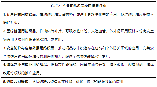 6.擴大產(chǎn)業(yè)用紡織品在國民經(jīng)濟各領(lǐng)域的應(yīng)用。支持企業(yè)、行業(yè)協(xié)會等機構(gòu)以國民經(jīng)濟各領(lǐng)域需求為導(dǎo)向,與有關(guān)方面加強交流合作,擴大產(chǎn)業(yè)用紡織品在航空航天、基礎(chǔ)設(shè)施建設(shè)、環(huán)境保護(hù)、建筑、能源、國防軍工等領(lǐng)域的應(yīng)用。