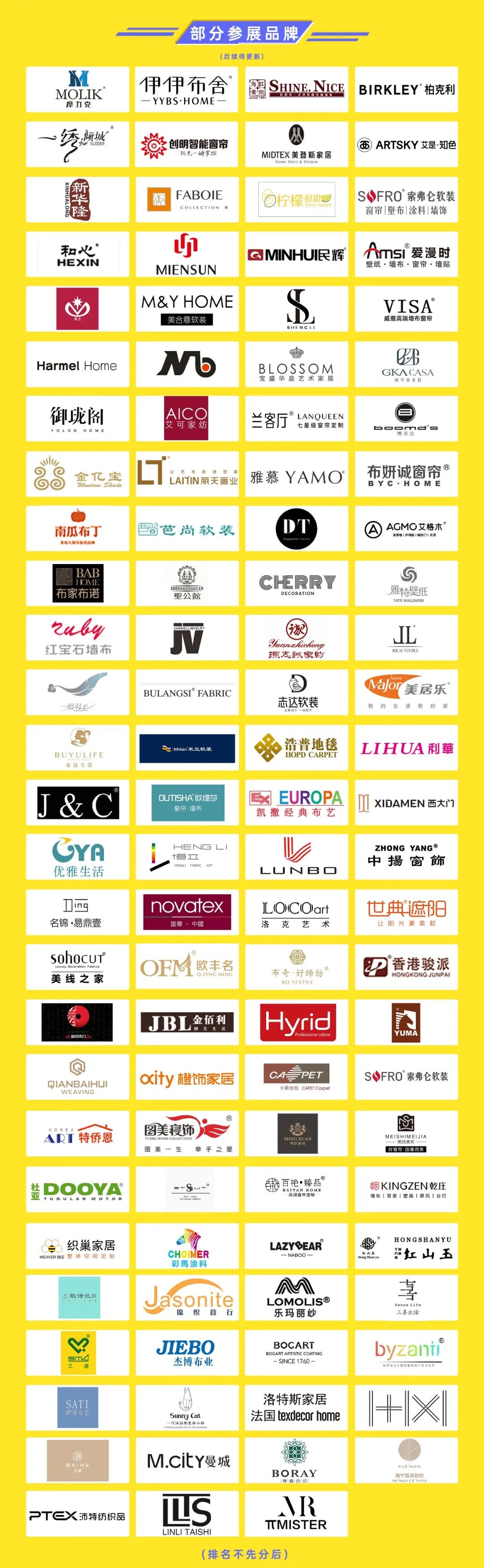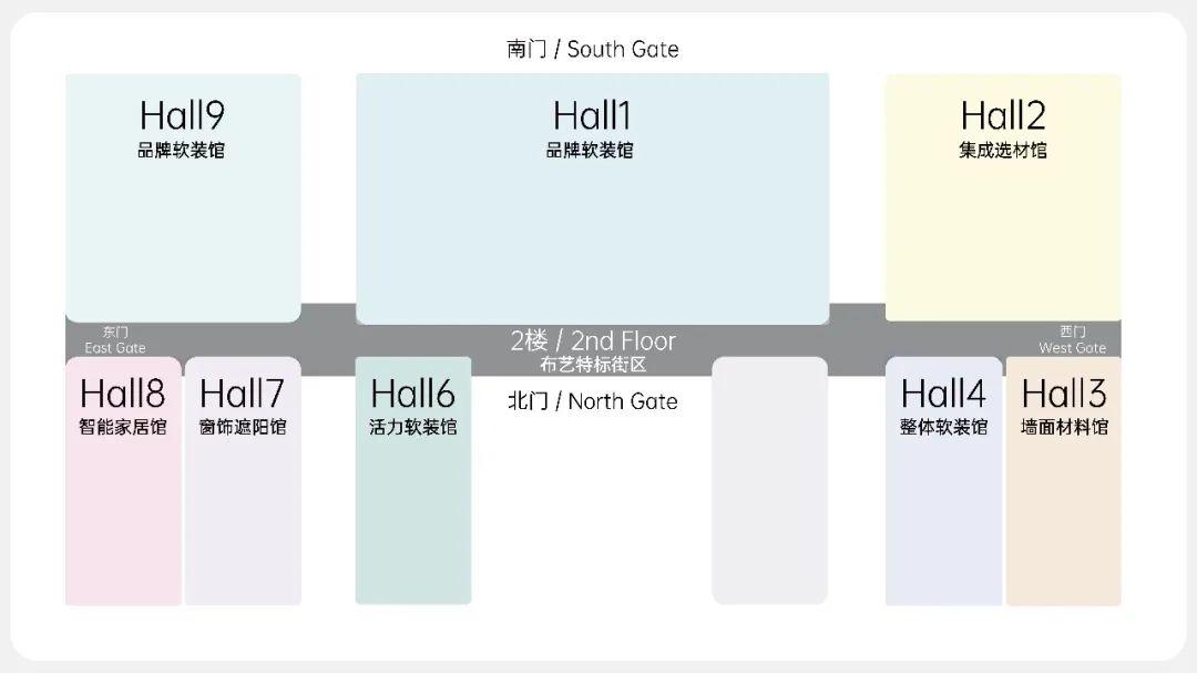 Hall1品牌軟裝館、Hall2集成選材館、Hall3墻面材料館、Hall4整體軟裝館、Hall6活力軟裝館、Hall7窗飾遮陽館、Hall8智能家居館、Hall9品牌軟裝館