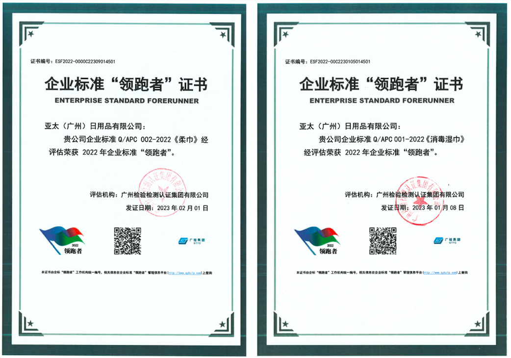 近日,亞太(廣州)日用品有限公司(以下簡稱“亞太”)企業(yè)標準Q/APC002-2022《柔巾》及企業(yè)標準Q/APC001-2022《消毒濕巾》,以旗下優(yōu)可舒品牌木柔洗臉巾和柔護濕巾2款產(chǎn)品為代表,經(jīng)過專業(yè)評定,榮獲2022年度企業(yè)標準“領(lǐng)跑者”證書(以下簡稱“企標‘領(lǐng)跑者’”)。