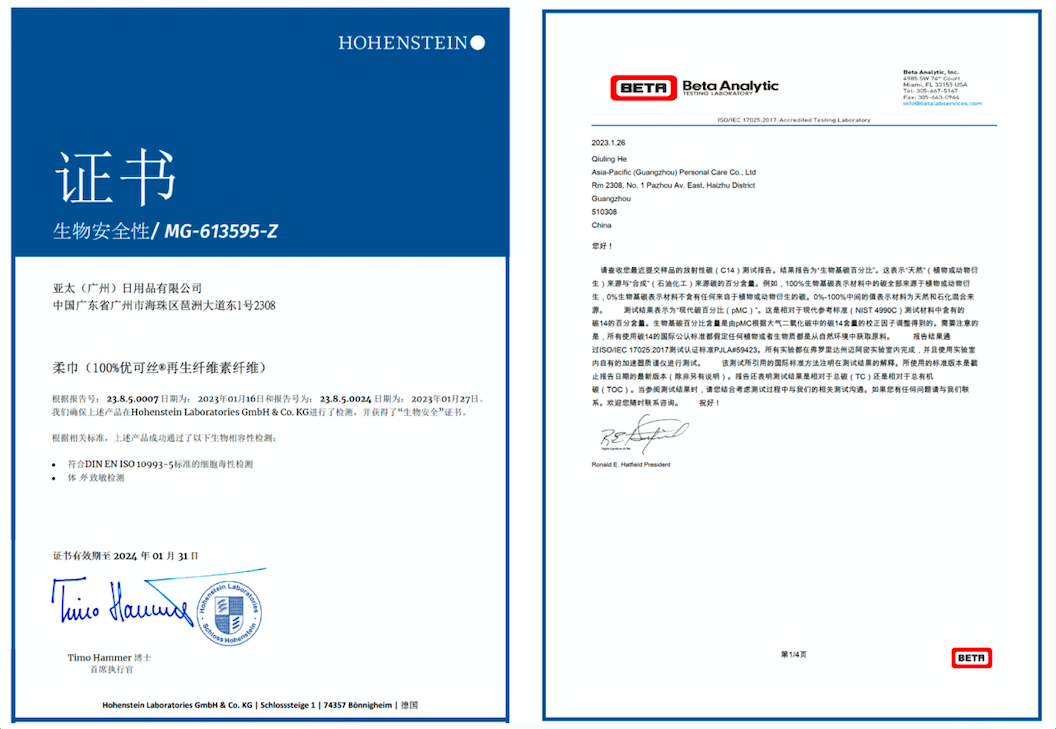 除了企標“領(lǐng)跑者”證書,優(yōu)可舒木柔洗臉巾還在德國海恩斯坦實驗室Hohenstein Laboratories GmbH & Co. KG進行檢測,通過細胞毒性測試和致敏性測試,并獲得了“生物安全”證書,致力打造更加不易致敏的安全產(chǎn)品。
