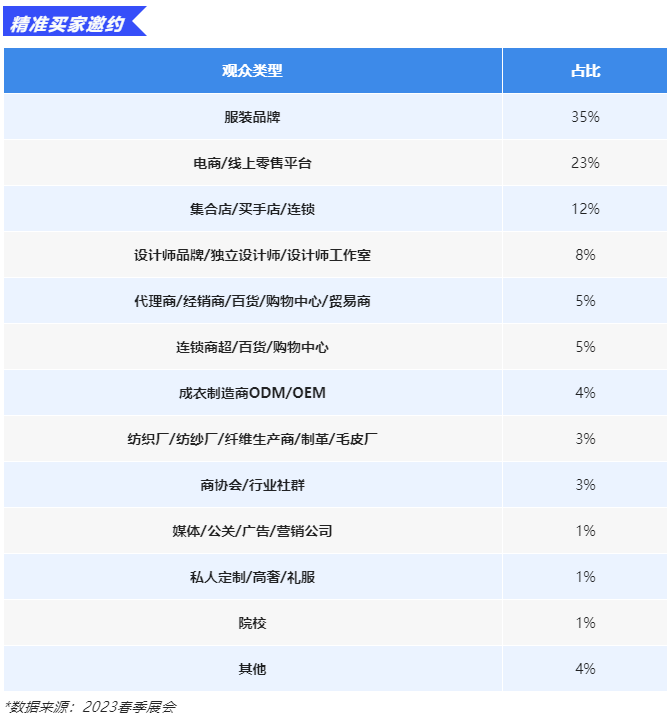 Fashion Source多年來致力鏈接優(yōu)質(zhì)資源,并持續(xù)對(duì)業(yè)內(nèi)的重點(diǎn)渠道、重點(diǎn)買家進(jìn)行深挖和精準(zhǔn)邀約。展前Fashion Source將針對(duì)10W+獨(dú)家數(shù)據(jù)庫(kù),一對(duì)一邀約紡織服裝行業(yè)品牌商、渠道商、電商等企業(yè)中任職的采購(gòu)/設(shè)計(jì)/研發(fā)等核心買家群體;展中開展多場(chǎng)面對(duì)面交流、類型豐富的商貿(mào)配對(duì),精準(zhǔn)對(duì)接、聯(lián)通供需,筑起雙方的溝通橋梁,為參展企業(yè)帶來更寬廣高效的市場(chǎng)營(yíng)銷渠道。