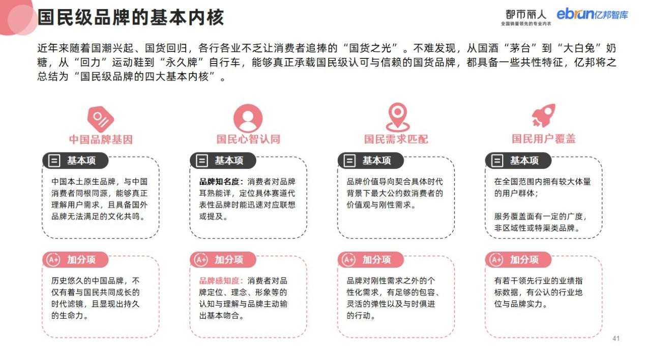 什么樣的品牌能夠稱之為國(guó)民級(jí)品牌??jī)|邦智庫(kù)提出國(guó)民級(jí)品牌應(yīng)具備中國(guó)品牌基因、國(guó)民心智認(rèn)同、國(guó)民需求匹配及國(guó)民用戶覆蓋四個(gè)基本內(nèi)核。