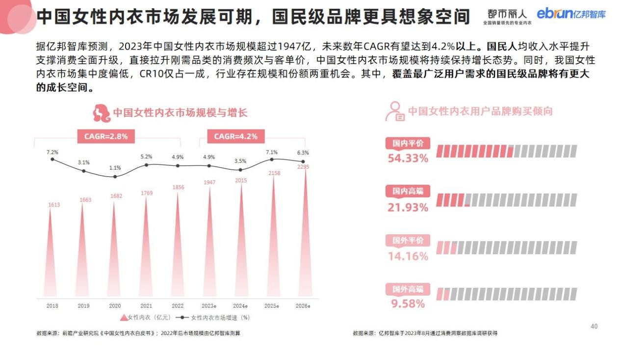 女性內(nèi)衣行業(yè)被稱為“服裝界的最后一塊蛋糕”,近幾年正成為資本市場(chǎng)角逐的焦點(diǎn),市場(chǎng)潛力不容小覷。根據(jù)億邦智庫(kù)預(yù)測(cè)數(shù)據(jù),2023年該市場(chǎng)規(guī)模將超過1947億,未來數(shù)年CAGR有望達(dá)到4.2%以上。