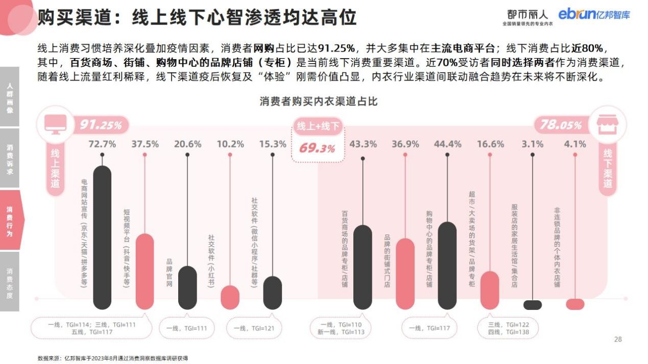 電商平臺(tái)、短視頻平臺(tái)及線下門店是當(dāng)前內(nèi)衣品牌建設(shè)觸達(dá)效果最優(yōu)的三大渠道;從認(rèn)知渠道個(gè)數(shù)看,消費(fèi)者認(rèn)知渠道多元,全域種草成大勢(shì)所趨。從購(gòu)買渠道看,線上線下心智滲透均達(dá)高位。購(gòu)買方便、有評(píng)價(jià)參考體系、種類款式選擇多是消費(fèi)者選擇線上購(gòu)買主要原因;而可以直接試穿體驗(yàn)、能直觀感受版型材質(zhì)、品質(zhì)保證是消費(fèi)者選擇線下渠道主要驅(qū)動(dòng)因素。