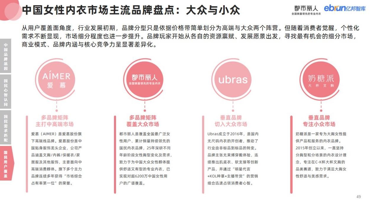 從國(guó)民用戶匹配維度,大眾人群具有絕對(duì)數(shù)量?jī)?yōu)勢(shì),賽道天花板足夠高,疊加我國(guó)女性內(nèi)衣的需求空間持續(xù)釋放,大眾品牌的增長(zhǎng)潛力巨大,相對(duì)更有機(jī)會(huì)誕生巨頭,典型代表是國(guó)民內(nèi)衣品牌都市麗人。小眾品牌則因賣點(diǎn)鮮明、個(gè)性突出,兼有獨(dú)特的功能或情緒價(jià)值,更容易精準(zhǔn)擊中目標(biāo)人群的消費(fèi)痛癢點(diǎn),典型代表有專注大杯市場(chǎng)的奶糖派等。