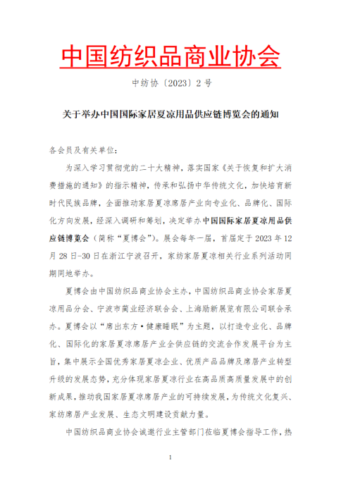 為深入學(xué)習(xí)貫徹黨的二十大精神,落實(shí)國(guó)家《關(guān)于恢復(fù)和擴(kuò)大消費(fèi)措施的通知》的指示精神,傳承和弘揚(yáng)中華傳統(tǒng)文化,加快培育新時(shí)代?族品牌,全面推動(dòng)家居夏涼席居產(chǎn)業(yè)向?qū)I(yè)化、品牌化、國(guó)際化方向發(fā)展,經(jīng)深入調(diào)研和籌劃,決定舉辦中國(guó)國(guó)際家居夏涼用品供應(yīng)鏈博覽會(huì)(簡(jiǎn)稱“夏博會(huì)”)。展會(huì)每年一屆,首屆定于2023年12月28日-30日在浙江寧波召開(kāi),家紡家居夏涼相關(guān)行業(yè)系列活動(dòng)同期同地舉辦。