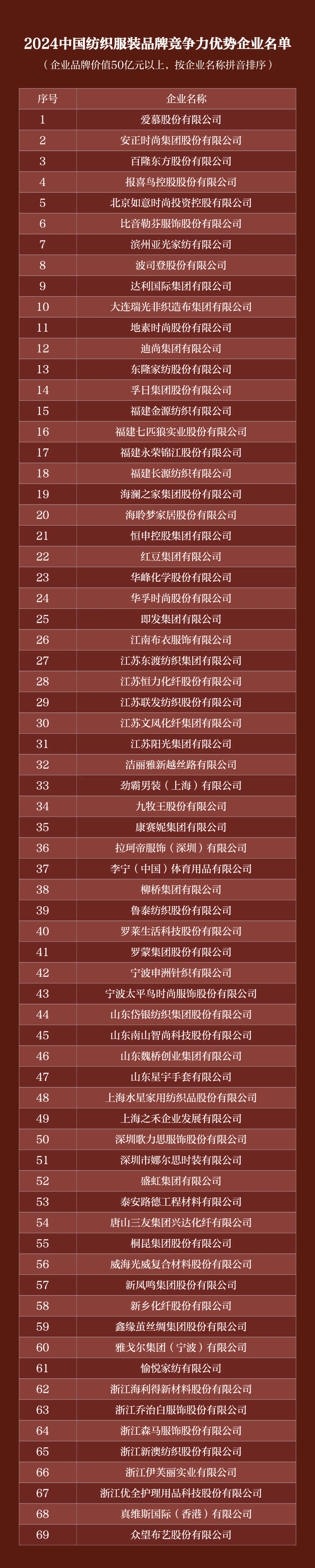 據(jù)介紹,基于相關(guān)國際標準、國家標準,優(yōu)化建立模型體系,通過系統(tǒng)評估,69家企業(yè)品牌價值超過50億元以上,確定為“2024中國紡織服裝品牌競爭力優(yōu)勢企業(yè)”。中國紡織工業(yè)聯(lián)合會將持續(xù)深化品牌培育與競爭力評價提升工作,緊密結(jié)合新時代品牌發(fā)展趨勢與需求,研究出具品牌競爭力評價提升報告與品牌價值證書,配套開展更具指導意義與實際推動價值的品牌培育系列工作。