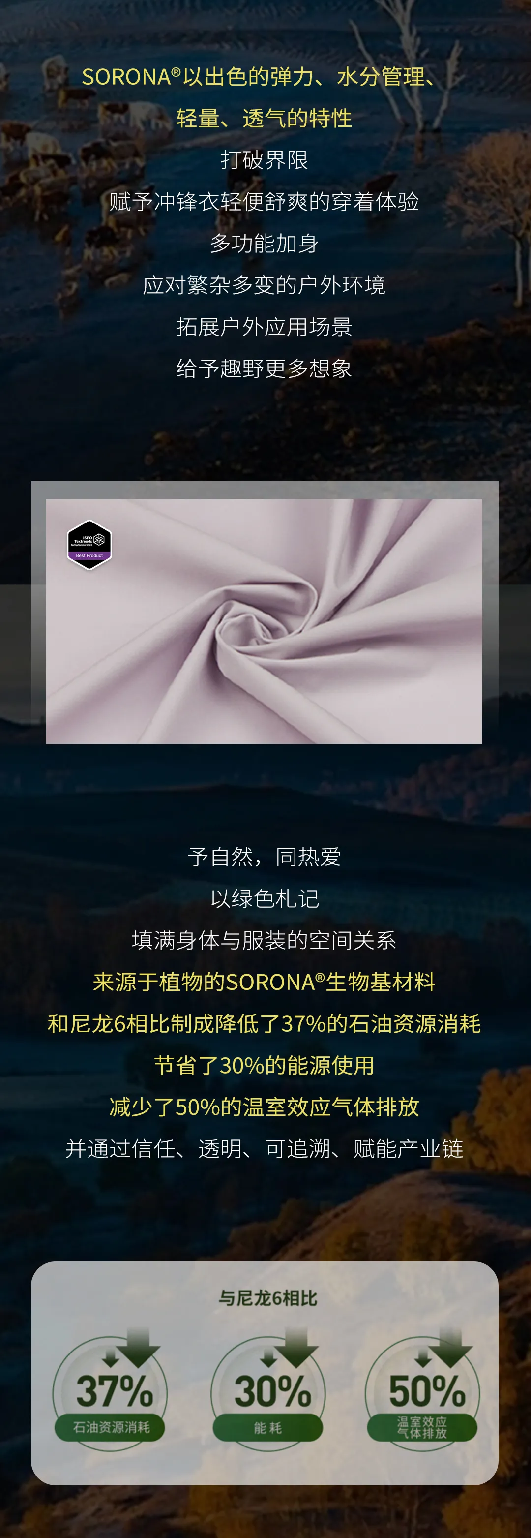SORONA®是一項(xiàng)突破性的新型生物基聚合物解決方案,其核心原料來自每年可重復(fù)生長的植物。SORONA®不僅具有符合潮流趨勢的可持續(xù)發(fā)展和環(huán)保主題,而且可以為纖維帶來多種功能的優(yōu)良特性。用SORONA®原料制成的纖維的“多功能性”為面料和服裝設(shè)計(jì)師提供了更大范圍的設(shè)計(jì)自由!