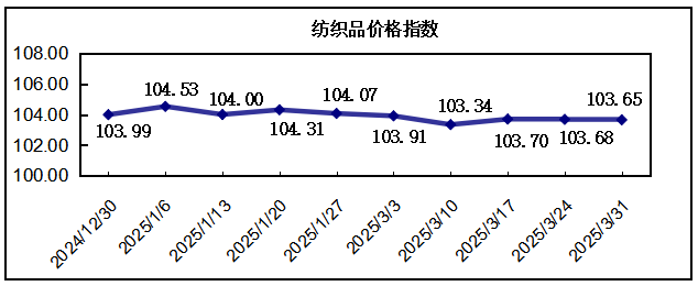 “中國·柯橋紡織指數” 20250331期紡織品價格指數收報于103.65點,環(huán)比下跌0.03%,較年初下跌0.84%,同比下跌1.33%。