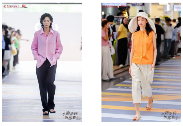 值得一提的是,本次走秀T臺(tái)縱穿整個(gè)東市場主通道,巧妙連接?xùn)|市場室內(nèi)與“水韻紡都”沿河區(qū)域,形成一道亮麗的風(fēng)景線,既體現(xiàn)了現(xiàn)代時(shí)尚感,又融入了東市場的文化底蘊(yùn)。同時(shí),現(xiàn)場設(shè)置“東市霓境”靜態(tài)展,以運(yùn)河沿岸的花草樹木為背景,動(dòng)與靜之間,盡顯柯橋紡織時(shí)尚魅力。