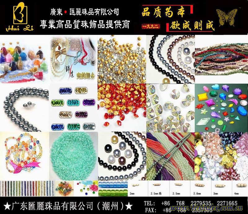 專業(yè)生產(chǎn).銷售各種進(jìn)口,國(guó)產(chǎn)工藝玻璃珠、珠管、PVC.PET珠片材料(散片、連線片、電腦盤片)、 塑膠珠(仿珍珠、雙色珠、花珠、金拉絲珠、皺紋珠、仿古銀珠)、尿素珠(環(huán)保)、ABS珠、 壓克力鉆、十字縫鉆、壓克力珠、木珠、玻璃鉆石(水鉆)、爪鉆(尖底、平底)、鉆鏈、中孔鉆、燙鉆、 天然翠石等工藝珠繡輔料.飾品, 本產(chǎn)品廣泛適用于服裝,婚紗,手袋,工藝鞋,燈飾,工藝品,圣誕品上的裝飾用料. 產(chǎn)地有,日本產(chǎn)、奧地利產(chǎn)、捷克產(chǎn)、韓國(guó)產(chǎn)、臺(tái)灣產(chǎn)、自產(chǎn)等依客戶所需供貨。 產(chǎn)品規(guī)格: 圓珠,角珠,珠管等一般直徑在1.5mm-5mm,中間有小孔,供穿紗線 玻璃彩珠:6/O,8/O,11/O.12/O.15/O…… 玻璃珠管:1",2",3",4",5"...... 玻璃角珠:6/O,8/O,11/O.... 塑料珠直徑:2mm,2.5mm,3mm,4mm,5mm,6mm,8mm,12mm.... 珠片(亮片)直徑:2mm.3mm,4mm,6mm,8mm,12mm...30mm 等各形狀,各規(guī)格,,品種齊全,質(zhì)量保證. 公司盡力做到與{"珠"}有關(guān)的全方位服務(wù),滿足各大客戶的需求, 熱誠(chéng)歡迎全國(guó)各地用料廠家,單位來(lái)樣,來(lái)電查詢,訂購(gòu),并能大量供貨. 愿與全國(guó)各地廠家,單位,真誠(chéng)合作,共同發(fā)展. ★業(yè)界唯一率先推出環(huán)保玻璃珠,珠片(PVC,PET)等珠飾品, 產(chǎn)品符合歐盟ROHS指令2002/95/EC及其補(bǔ)充指令2005/618/EC3的要求★ 定貨時(shí)請(qǐng)說(shuō)明需不需要環(huán)保料,(注:所發(fā)布圖片及文字未經(jīng)匯麗公司明確書面授權(quán)許可任何單位或個(gè)人 不得以任何方式復(fù)制、傳載,謝謝合作!最終版權(quán)、解釋權(quán)歸匯麗珠品有限公司所有!)