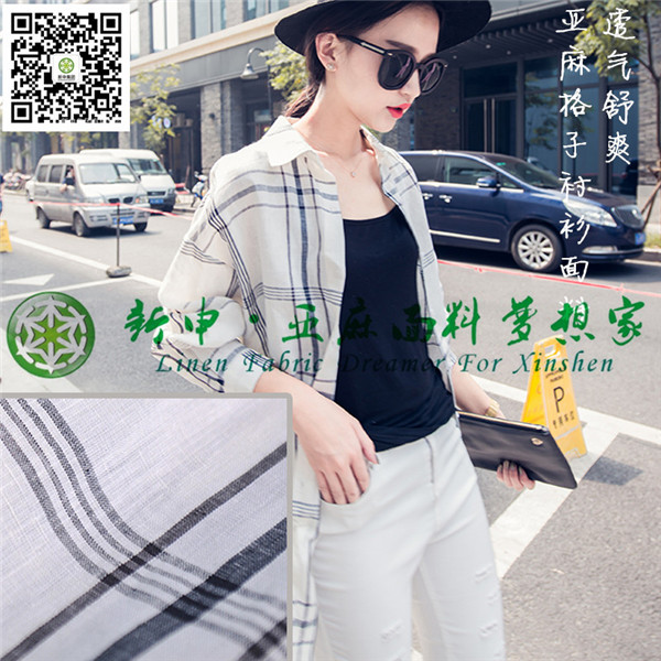 優(yōu)質(zhì)純亞麻寬松落肩休閑格子女襯衫面料