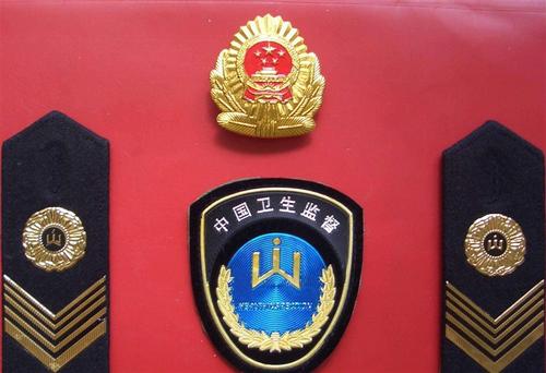 (三)***:高分子pu材料特種工藝制成,黑色底,金***案由衛(wèi)生監(jiān)督圓形徽和五條由寬到窄的折線組成。