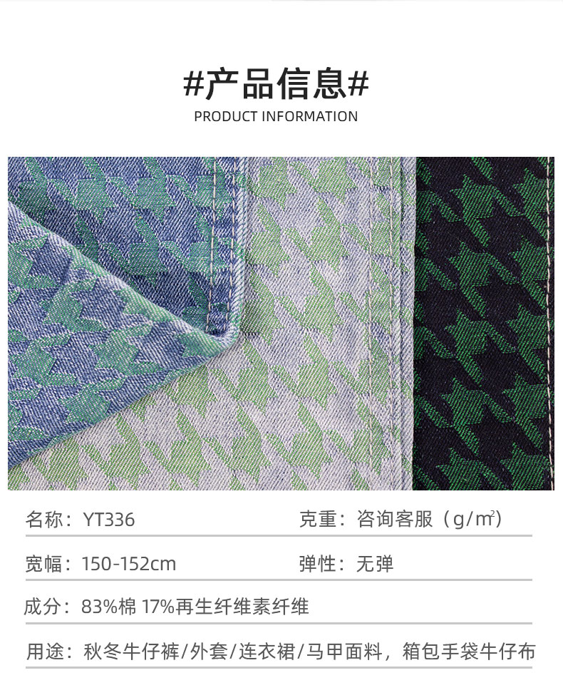 關(guān)鍵字:千鳥格,提花牛仔面料,賽絡(luò)紡,秋冬面料