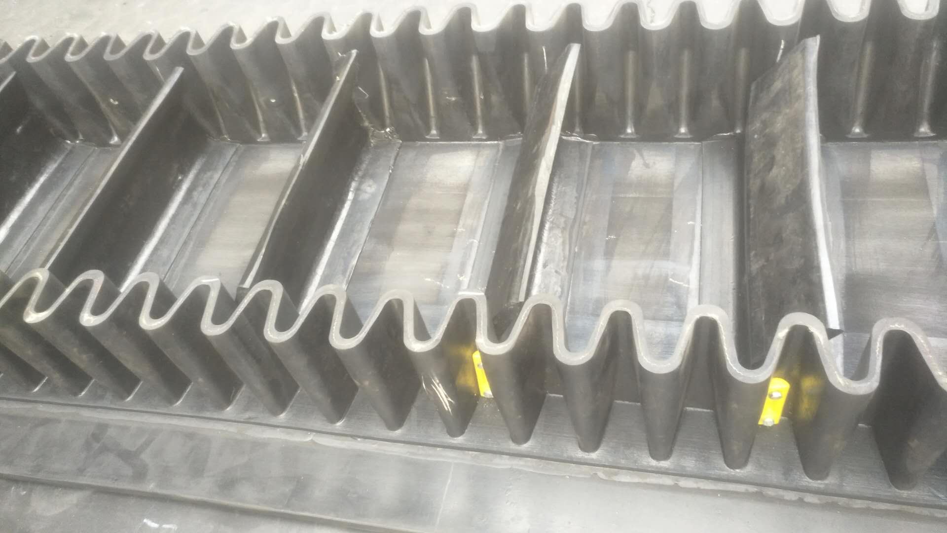大傾角波狀擋邊帶由基帶、波紋擋邊、橫隔板3部分組成。擋邊起防止物料測(cè)滑撒落的作用。為便于繞過(guò)滾筒,檔邊設(shè)計(jì)成波紋狀;橫隔板的作用是承托物料,為了實(shí)現(xiàn)大傾角輸送,采用T型TC型設(shè)計(jì)。檔邊和橫隔板是用二次硫化的方法與基帶連接的,具有很高的連接強(qiáng)度。