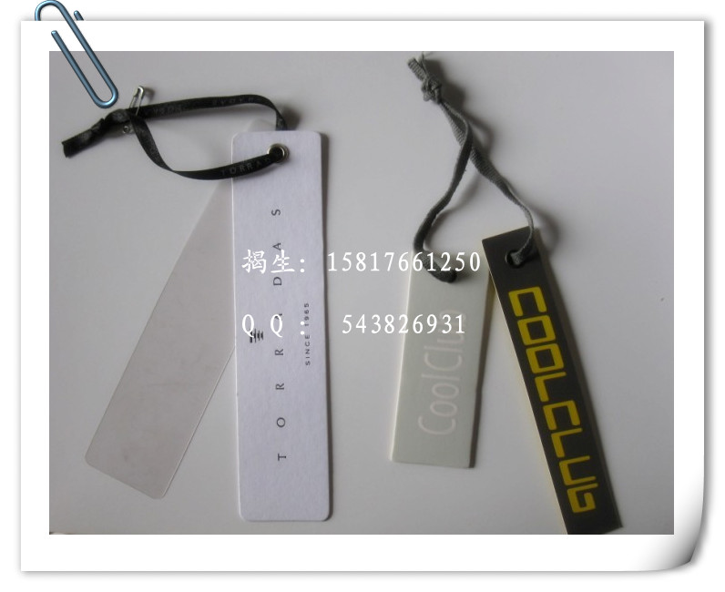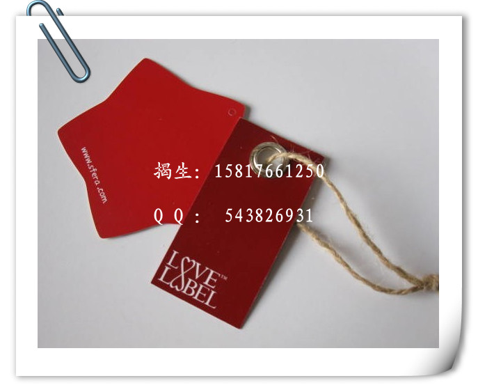 吊牌:吊牌(Tag 或Tagcard)的制作,按介質分有紙制的、塑料的、金屬的;按形狀結構分有長方形、對折形、圓形、三角形、插袋式以及其它特殊造型的;按功能分有普通型、條碼防偽型和全息防偽型等等
