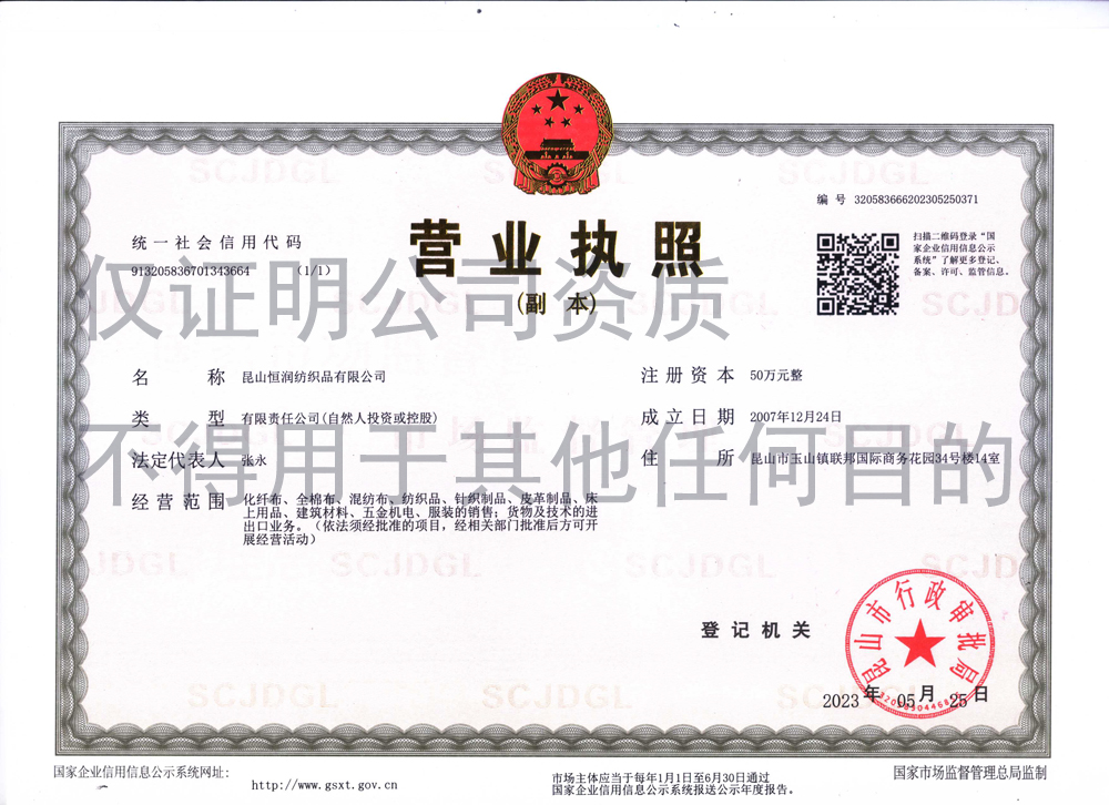 昆山恒潤紡織品有限公司位于中國經(jīng)濟(jì)文化重鎮(zhèn)江蘇昆山,是一家專業(yè)開發(fā)、生產(chǎn)、銷售化纖面料的企業(yè),以經(jīng)營各種功能性面料著稱。所生產(chǎn)的高防水、透汽透濕面料、阻燃面料、防靜電面料、EN471熒光面料、抗紫外線面料等產(chǎn)品均達(dá)到或超過同類產(chǎn)品的質(zhì)量標(biāo)準(zhǔn)。