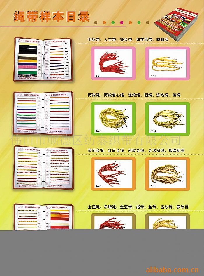 紡泰織帶有限公司位于交通方便,經(jīng)濟迅速騰飛的廣東省佛山市順德區(qū),專業(yè)生產(chǎn)經(jīng)營:手挽繩/手袋繩/手提繩(3針-64針)、提花帶、尼龍繩、pp繩、七彩繩、蠟繩、裝飾繩、發(fā)飾繩、圓型繩、扁型繩、松緊繩、空芯繩、包芯繩、扭繩、提花帶、滌綸帶、手機吊帶、平紋帶、羅紋帶、人字帶、緞帶、印字帶、鞋帶、金絲紗帶、圣誕帶、胸圍帶、花邊帶、安全帶、彩帶、松緊帶、蝴蝶結(jié)、花仔、雞眼、背膠魔術(shù)貼等。另外,可按客戶的要求對產(chǎn)品進行熱切、裁剪、打扣、啤咀、絲印、縫制及手工編織。