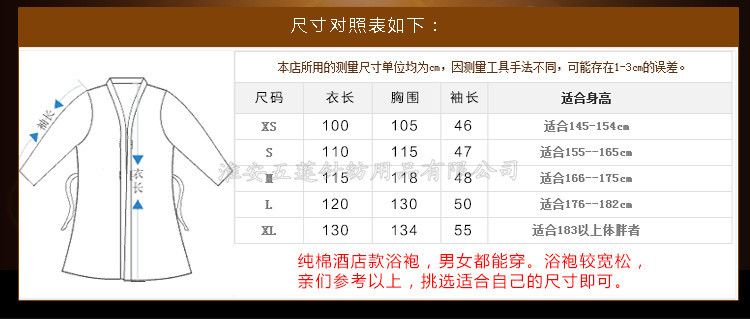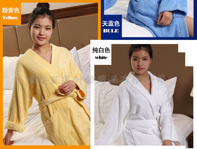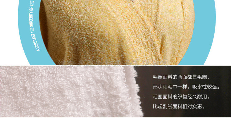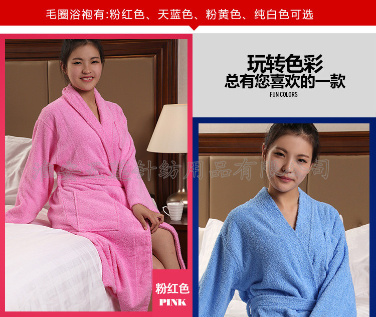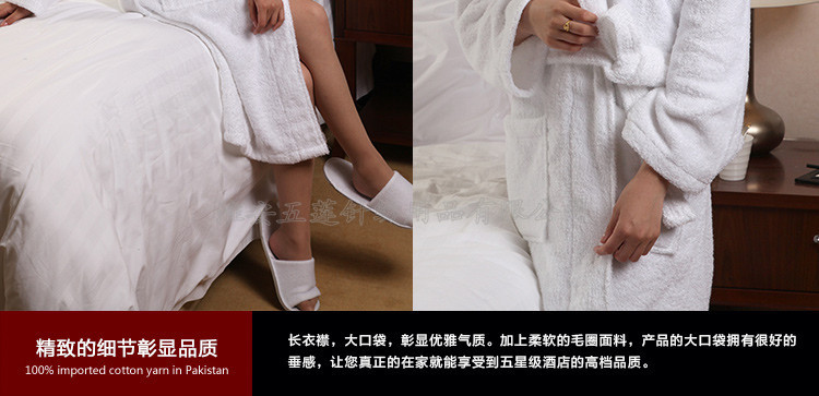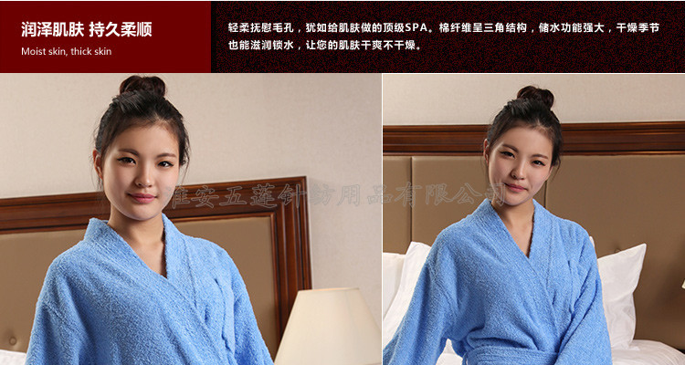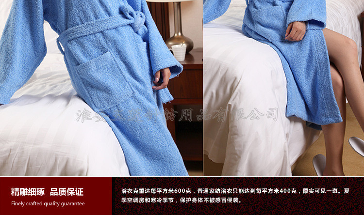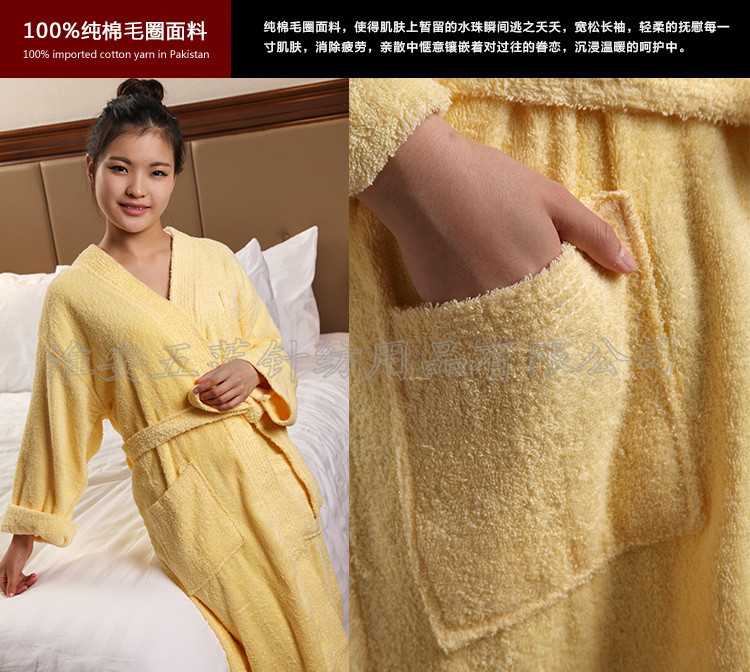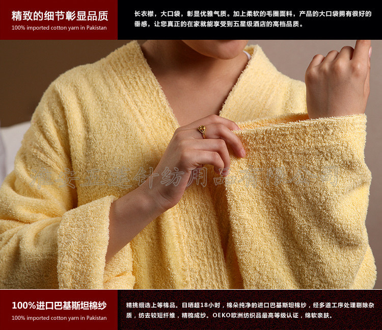 全棉毛圈浴袍春夏秋浴衣 酒店全棉男女 全棉毛巾料情侶浴袍,選取材料為純天然的巴基斯坦棉紗,采用天然的材料與精湛的毛巾制作工藝結(jié)合而成;不加任何有刺激、傷害人體的化學(xué)染劑。綠色環(huán)保、源自天然。優(yōu)質(zhì)的棉紗做出來的毛巾,不僅舒適柔軟而且具有按摩皮膚和緩解疲勞的生物功效。毛圈平整、均勻,毛巾摸著柔軟、蓬松。聞著無異味。水洗不會掉色。
