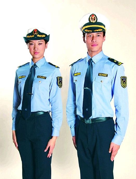 中國海監(jiān)制服共有春秋裝、冬裝、夏裝、防寒服、制式毛衣、作訓(xùn)服、連體工作服、標(biāo)志服飾、制式帽子、作訓(xùn)帽、皮鞋等品種。春秋裝、冬裝、夏褲和裙裝選用藏青色為主體色彩,搭配淺藍(lán)色襯衫,體現(xiàn)執(zhí)法部門莊重、嚴(yán)謹(jǐn)?shù)穆殬I(yè)特點(diǎn),領(lǐng)帶選擇深藍(lán)色,金色金屬和絲織標(biāo)志配飾用來點(diǎn)綴整體服裝。該系列服裝將春秋裝、冬裝的款式由原來的西裝樣式改為國內(nèi)外制式服裝主流的獵裝樣式,制式長、短袖襯衣由小翻領(lǐng)夾克款式調(diào)整為立領(lǐng)束腰式。新增加的胸標(biāo)、號(hào)牌、臂章等服飾標(biāo)志,增強(qiáng)了海監(jiān)服裝的識(shí)別功能,強(qiáng)化了制服的美感