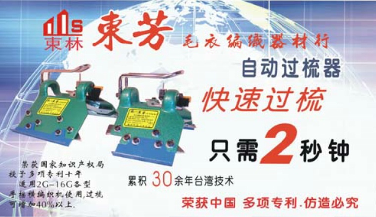 東芳毛衣編織器材行生產(chǎn)的自動(dòng)過梳器行銷世界各地三十多個(gè)國家,亦是各大編織制造廠指定配件的過梳器材.