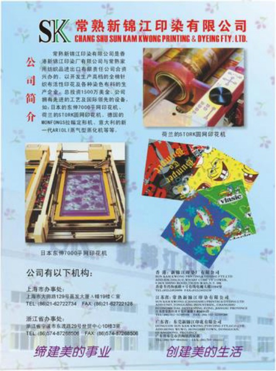 常熟新錦江印染有限公司是香港新錦江印染有限公司與常熟家用紡織品進(jìn)出口有限責(zé)任公司合資興辦的,以開發(fā)生產(chǎn)高檔活性印花及各種印花布料的生產(chǎn)企業(yè),公司有自營(yíng)進(jìn)出口權(quán)??偼顿Y1500萬美元。隸屬江蘇省常熟經(jīng)濟(jì)開發(fā)區(qū)通港工業(yè)園,是本地區(qū)投資最大的印染企業(yè)之一。