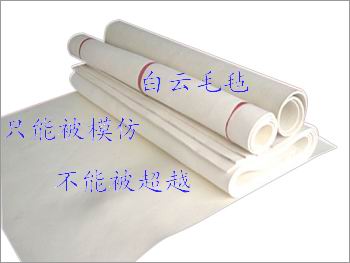 南宮市白云毛氈廠是一家股份制氈廠,是由絨毛制氈廠,機(jī)制氈油封廠于一九九六年合建而成,為了質(zhì)量在毛氈市場(chǎng)遙遙領(lǐng)先,羊毛粗細(xì),黑白不混雜,使毛氈達(dá)到真正純凈化.為此特組建了五個(gè)專業(yè)分廠;一廠專業(yè)生產(chǎn)高精毛氈,采用80支-100支羊毛加30%空心羊絨,合成0.14克-0.55克工業(yè)毛氈,此氈專門用于高級(jí)防震,清音,隔音,墊片。二廠專業(yè)生產(chǎn)國(guó)標(biāo)白色粗細(xì)工業(yè)羊毛氈,三廠專業(yè)生產(chǎn)毛氈制品,四廠專業(yè)生產(chǎn)黑色粗,細(xì)工業(yè)氈及民用毛氈,五廠專業(yè)生產(chǎn)化纖氈,無(wú)紡布,印畫氈,混紡毛氈。主要生產(chǎn)、制作各種規(guī)格的毛氈及毛氈制品。產(chǎn)品品種有:毛氈系列;細(xì)白工業(yè)羊毛氈、中粗羊毛氈、彩色羊毛氈、松軟毛氈、吸油毛氈、化纖針刺氈、拋光氈、不銹鋼拋光氈、體育用品毛氈、保溫防寒氈、過濾毛氈、馬鞍毛氈、工藝毛氈、板擦用毛氈、印臺(tái)氈、書畫氈、樂器用毛氈、毛氈鼓槌,鞋墊氈、民用毛氈、帳篷用氈等各種行業(yè)用氈。毛氈配件系列;毛氈墊、毛氈條、毛氈圈、毛氈環(huán)、毛氈筒、毛氈帶、毛氈塊、毛氈油封,毛氈密封墊,羊毛氈煞車片、各種異形毛氈配件可根據(jù)用戶要求生產(chǎn)加工。拋光系列;拋光氈、羊毛輪、毛氈輪、玻璃拋光輪、鏡面拋光輪、陶瓷羊毛拋光輪、不銹鋼拋光輪、拋光片、粘扣羊毛球、系帶羊毛球、單面羊毛球、雙面羊毛球可用于各行業(yè)的拋光。本公司產(chǎn)品適用于:航天、航空、軍工、機(jī)械、機(jī)電、化工、礦山、水泥、造紙、磁性材料、皮革、體育防護(hù)用品、健身器材煞車片、文具、漆包線、車輛船舶、紡織器械、各種電器、玩具、電子產(chǎn)品。也可用于大理石、不銹鋼、玻璃、陶瓷、精密家具拋光,汽車、輪船、機(jī)械、機(jī)床等設(shè)備防塵、密封、隔音、保溫、絕緣、絕熱等。還可根據(jù)用戶圖紙要求制作各種異形零件 網(wǎng)址:http://www.ngbaiyun.com http://www.yangmaozhan.com.cn